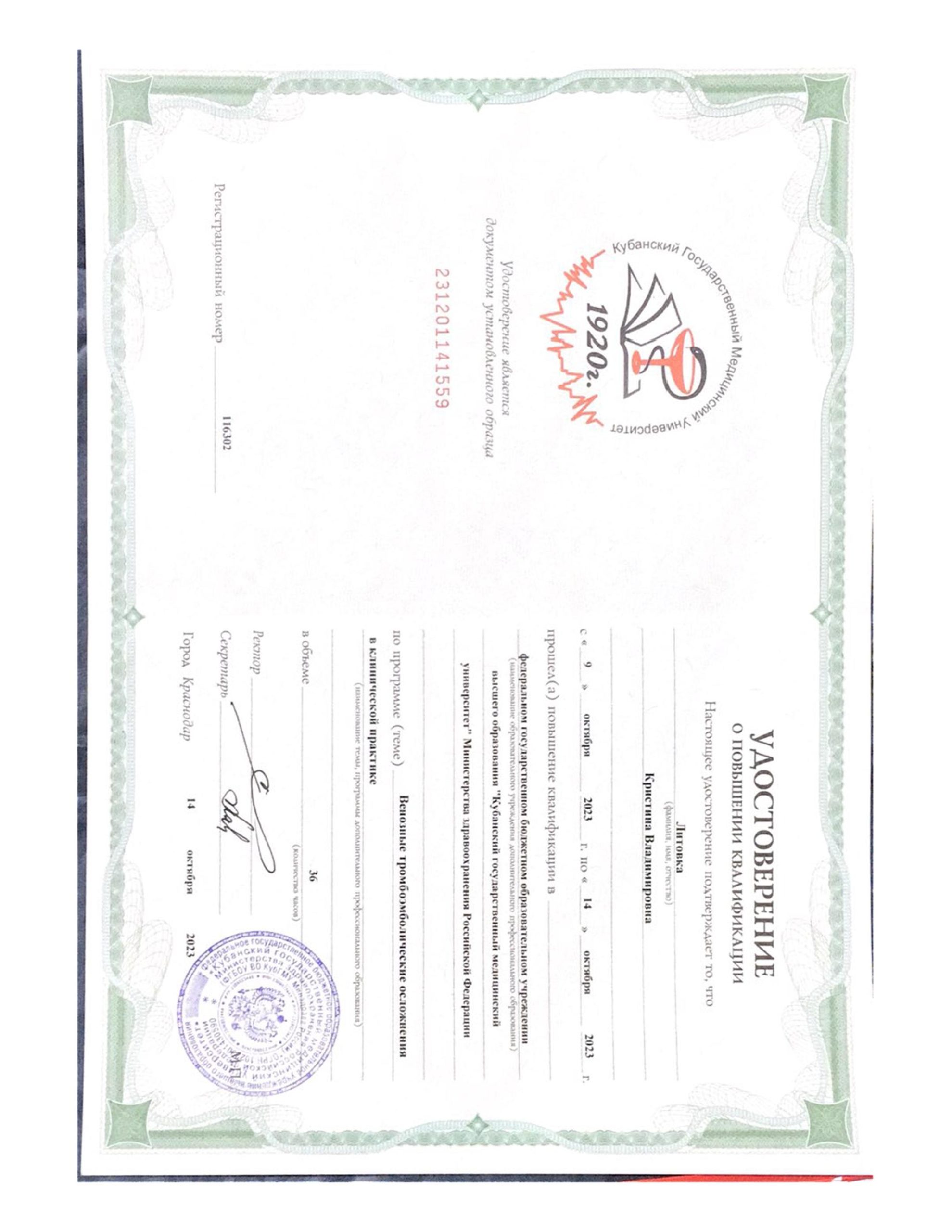 • Повышение квалификации в ФГБОУ ВО «Кубанский государственный медицинский университет» Министерства здравоохранения РФ по программе «Венозные тромбоэмболические осложнения в клинической практике» 36ч., 2023г.