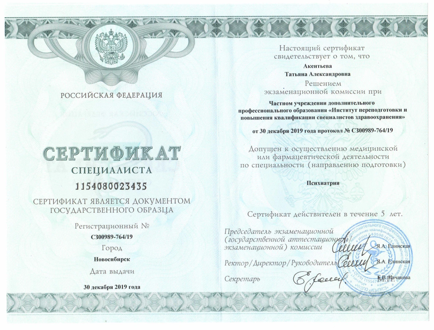 - 2019 год – Новосибирский институт переподготовки и повышения квалификации специалисто здравоохранения – Переподготовка по специальности “Психиатрия”